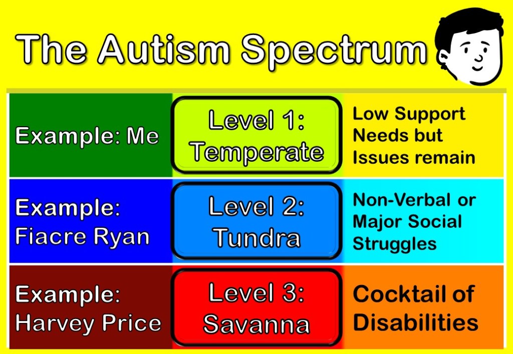 You may be wondering why I have placed random climate terms below each level. Well, that’s because I think each level is like a different type of climate that, unlike our real one, generally does not fundamentally change without supports that would never be endorsed by Autism Speaks.